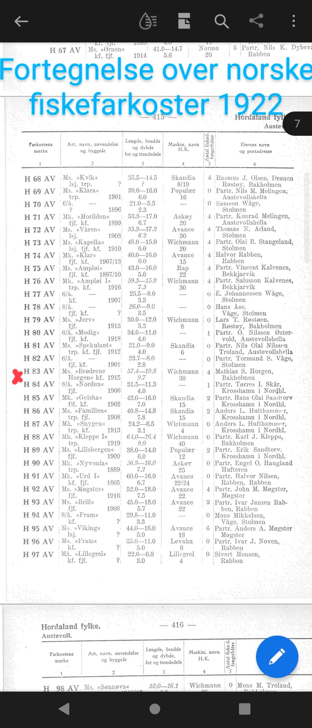 H-83-AV M/S «Brødrene Horgen» på 57,4 fot og 30 hk. eies av Mathias Horgen fra 1921 til 1937.