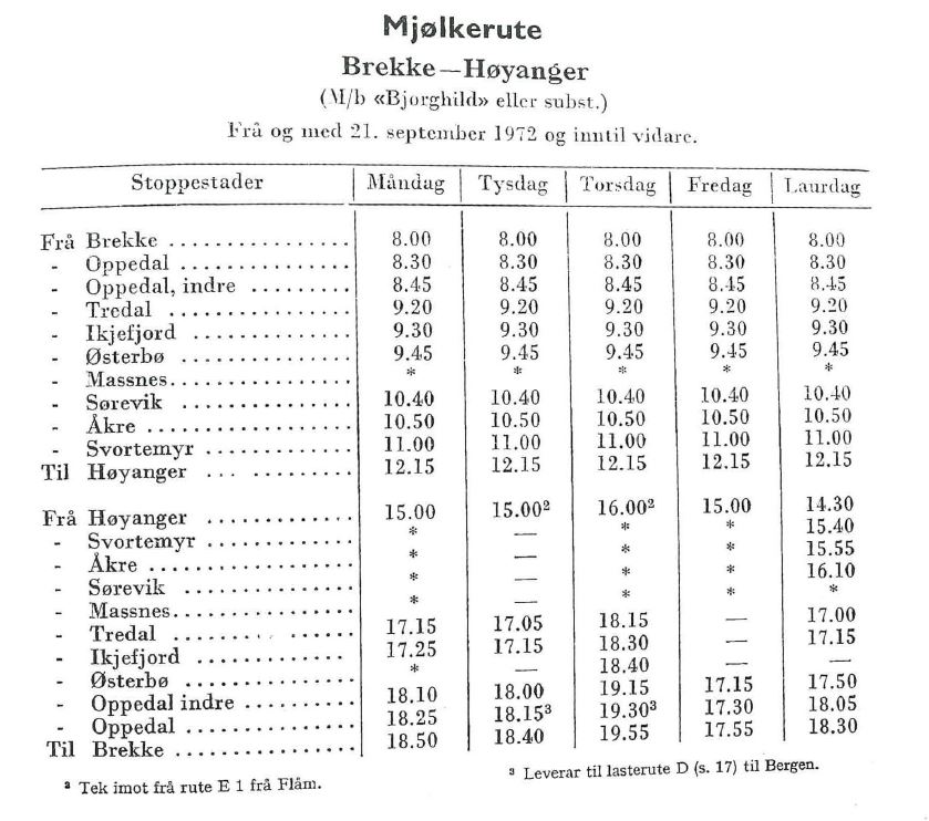 For the next 25 years, she operated on a fixed daily route (except Sundays) in the Sognefjord. Every day, Bjørghild collected milk from local farmers and delivered it to the dairy. There was a post office on board and a heated saloon for passengers on deck. The vessel also transported cows and horses.